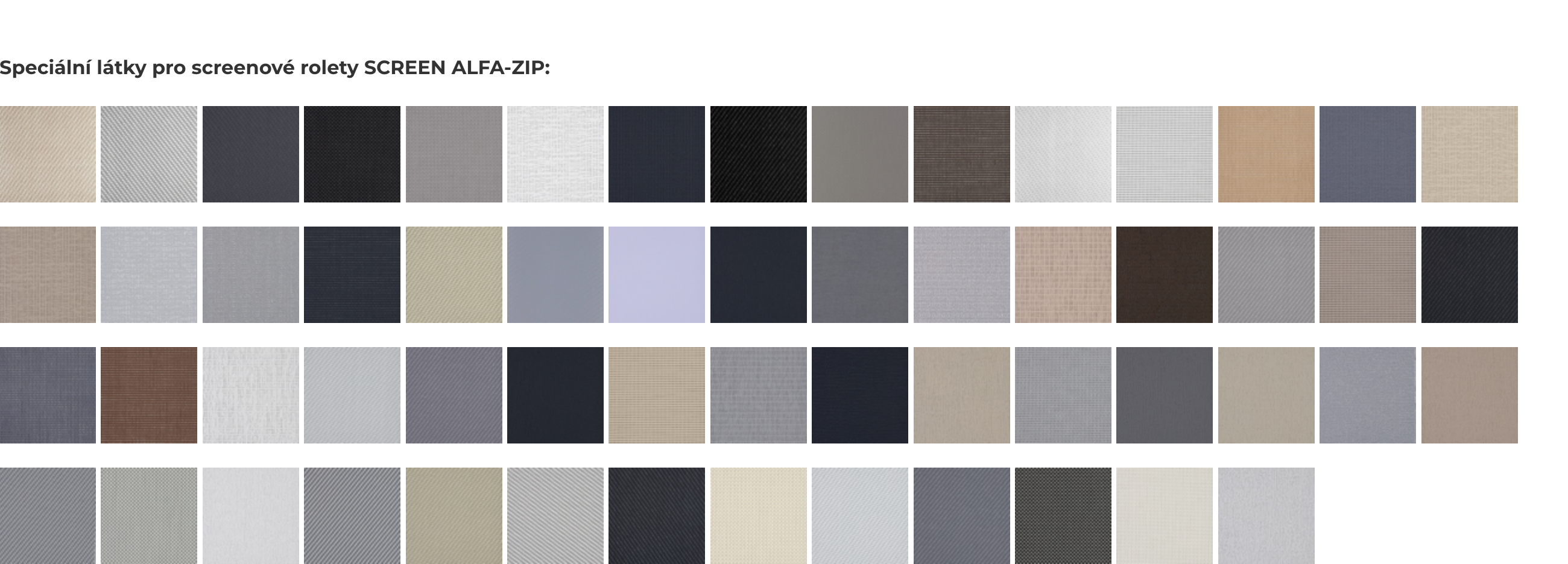 Přehled speciálních látek pro screenové rolety. Finální výběr a dostupnost vždy upřesníme při zaměření.