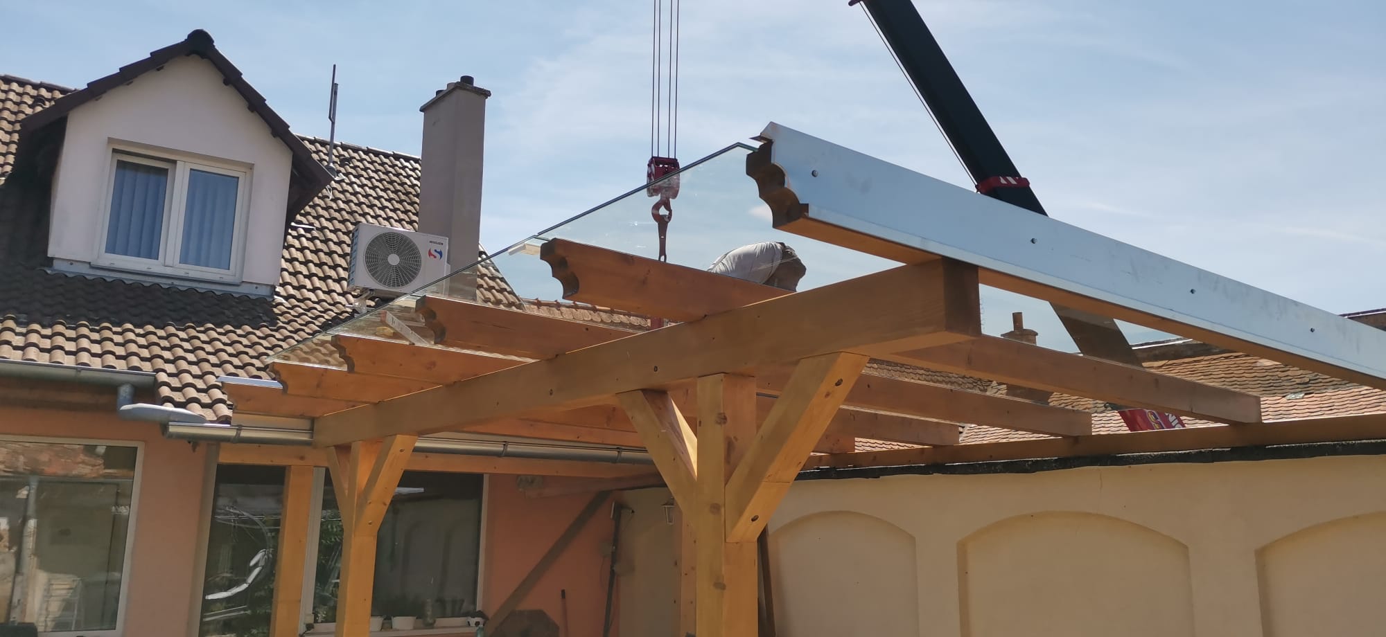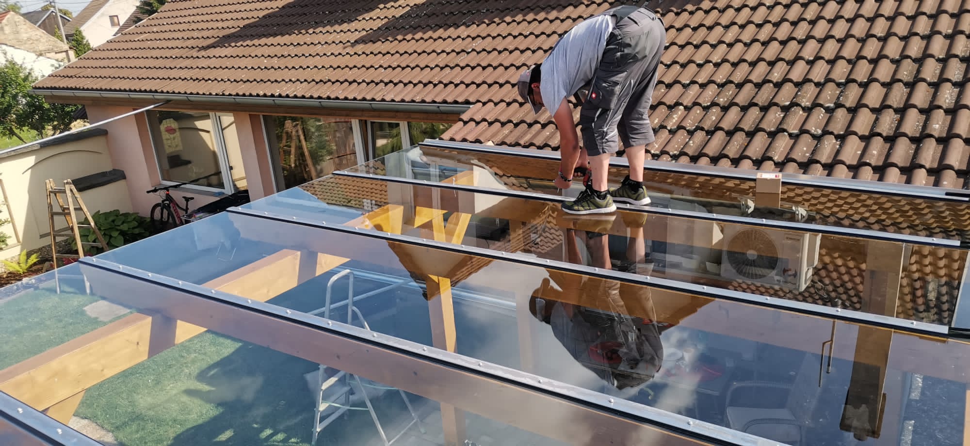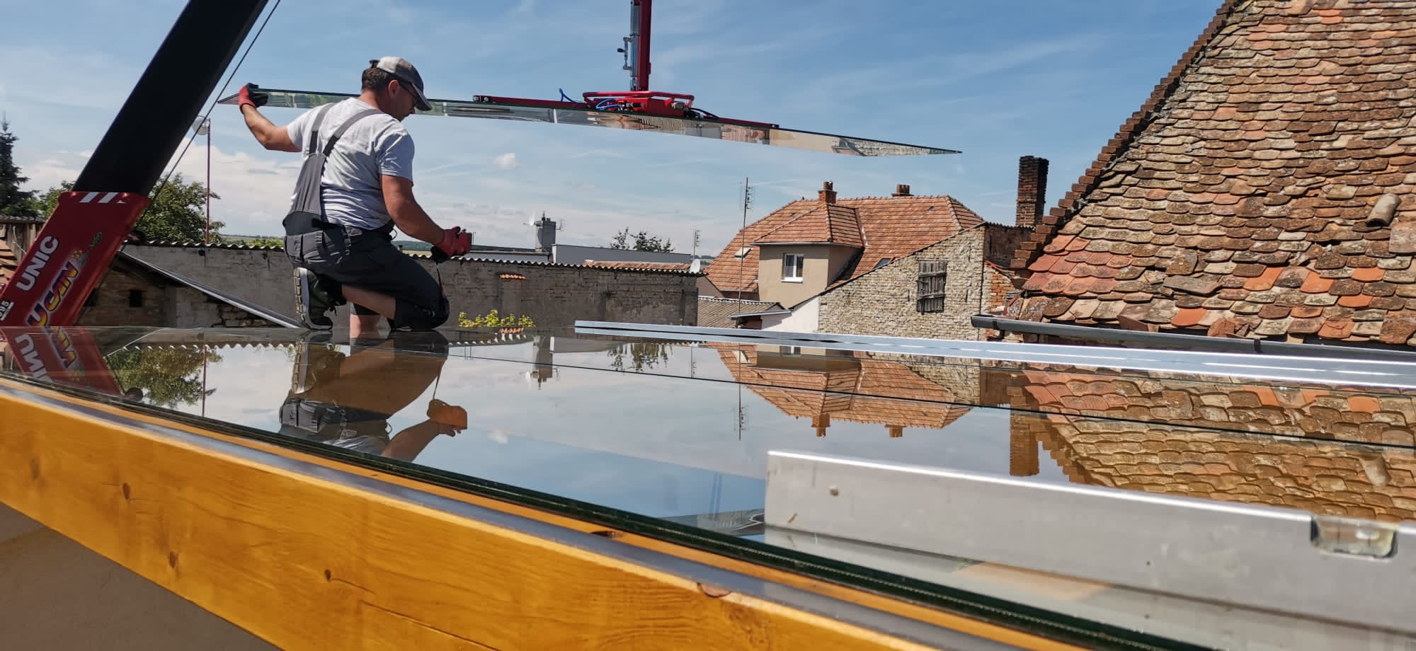 Při této realizaci bylo nutné manipulovat s velkoformátovými skleněnými panely, které vyžadují přesnou a bezpečnou instalaci. Pro montáž byla použita naše speciální plošina Unic URW 095, která umožňuje práci ve výškách i ve velmi stísněných prostorách.